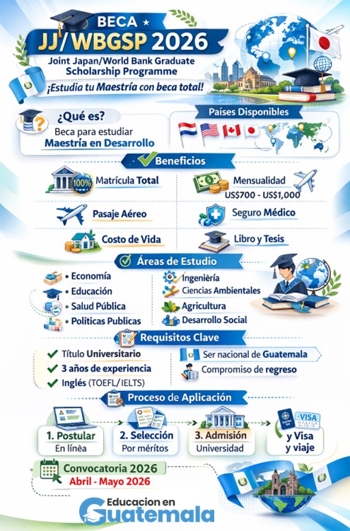 La JJ/WBGSP es una de las becas más completas y competitivas del mundo. Está financiada por el Gobierno de Japón y administrada por el Banco Mundial, y su objetivo es formar profesionales de países en desarrollo (como Guatemala) para que regresen a aportar al desarrollo de su país.