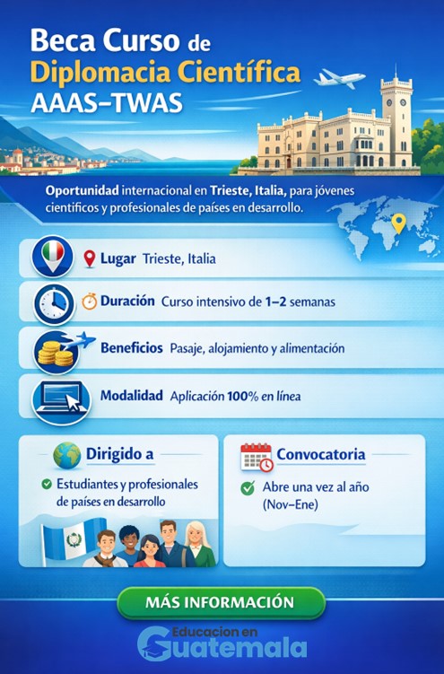 Las Becas para el Curso de Diplomacia Científica (AAAS–TWAS) son una oportunidad internacional de alto nivel dirigida a estudiantes y profesionales de países en desarrollo, como Guatemala, que desean formarse en la intersección entre ciencia, política pública y relaciones internacionales. El curso se realiza en Trieste, Italia, uno de los principales centros científicos de Europa.