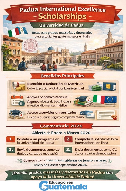 Las Padua International Excellence Scholarships representan una oportunidad significativa para que estudiantes guatemaltecos cursen estudios de maestría, grado o doctorado en Italia, con apoyo económico y académico.